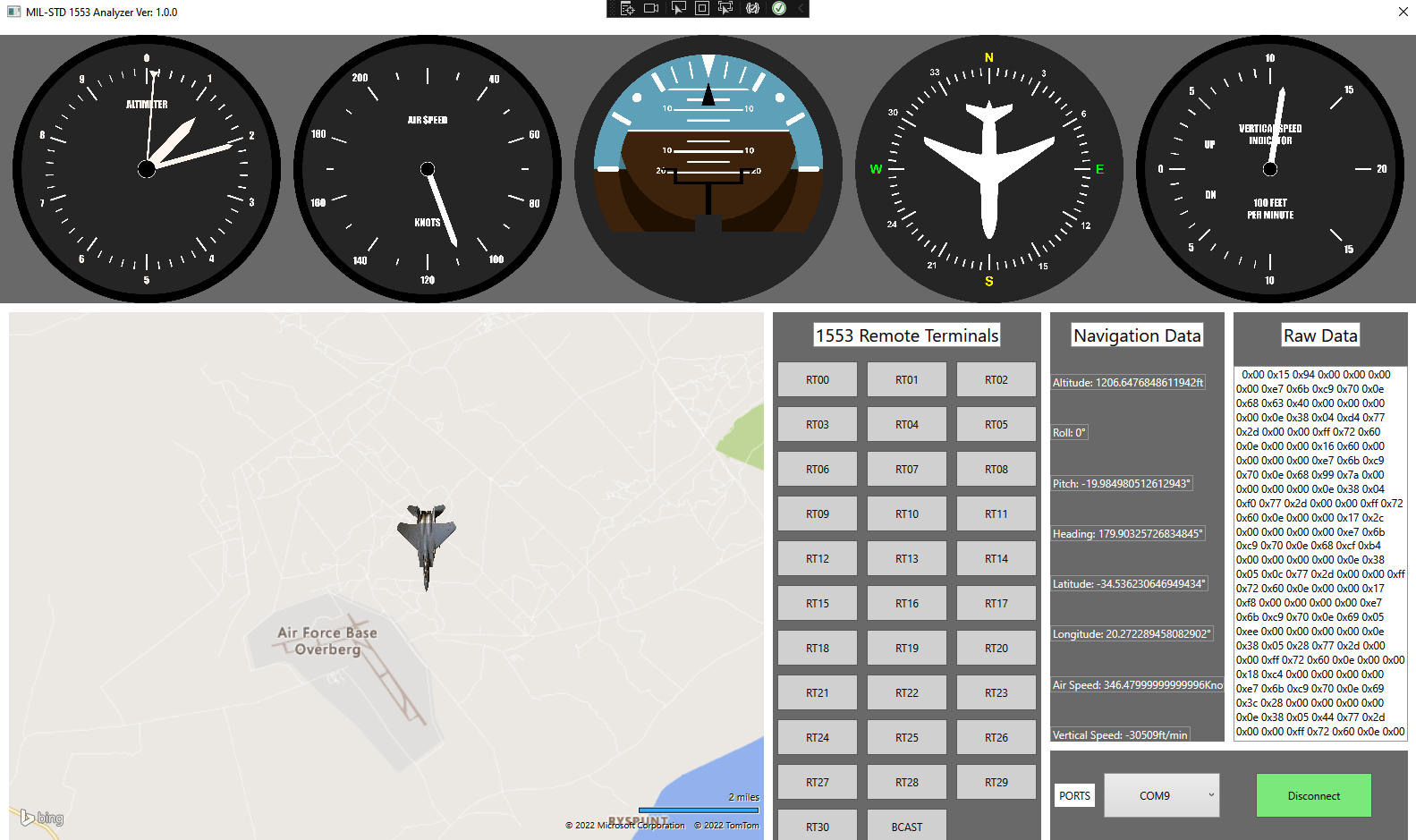 The 1553 Analyzer product is a unit that behaves as a Remote Terminal on the 1553 bus. It captures navigation information from the bus. The information is analyzed and displayed on a user interface. The 1553 Analyzer consist of a neatly packaged standard 1U unit ready to be rack-mounted, and a software running on a laptop.